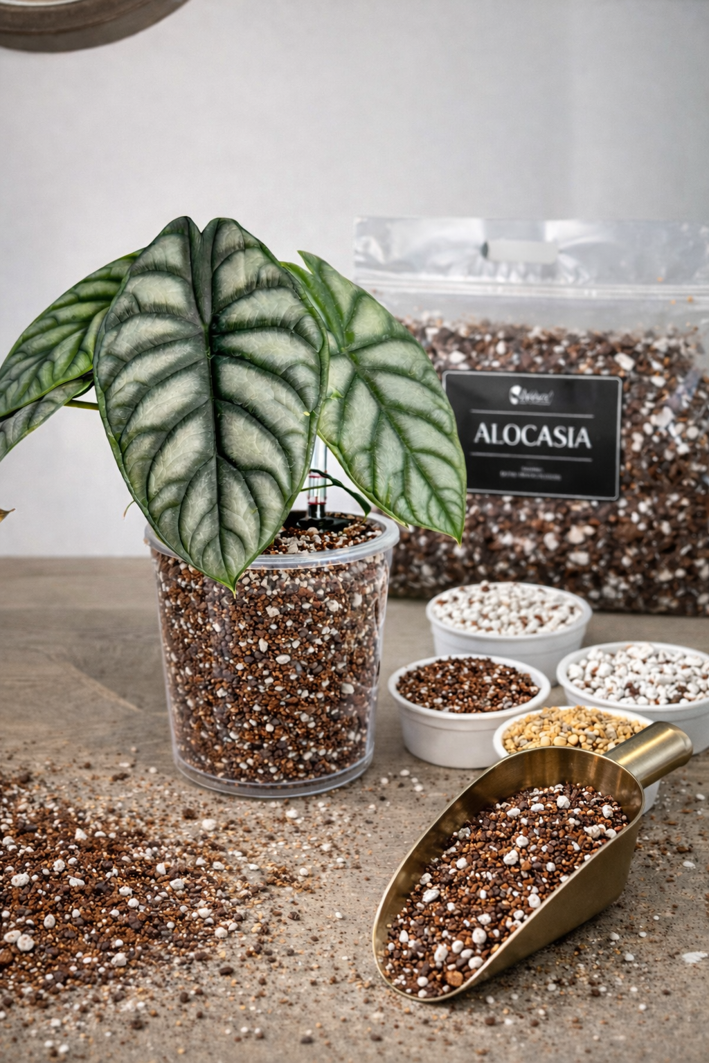 A perfectly balanced soil-free  blend that offers superior aeration, drainage, and moisture retention, specifically designed to meet the needs of your Alocasia plants.